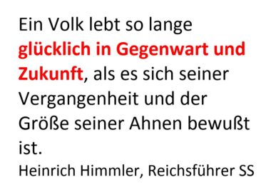 Text des Bildes für die automatische Übersetzung: Ein Volk lebt so lange glücklich in Gegenwart und Zukunft, als es sich seiner Vergangenheit und der Größe seiner Ahnen bewußt ist. Heinrich Himmler, Reichsführer SS