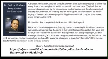 Text des Bildes für die automatische Übersetzung: „Dr. Andrew Moulden: Every Vaccine Produces Harm. Canadian physician Dr. Andrew Moulden provided clear scientific evidence to prove that every dose of vaccine given to a child or an adult produces harm. The truth that he uncovered was rejected by the conventional medical system and the pharmaceutical industry. Nevertheless, his warning and his message to America remains as a solid legacy of the man who stood up against big pharma and their program to vaccinate every person on the Earth. Dr. Moulden died unexpectedly in November of 2013 at age 49. Because of the strong opposition from big pharma concerning Dr. Moulden’s research, we became concerned that the name of this brilliant researcher and his life’s work had nearly been deleted from the internet. His reputation was being disparaged, and his message of warning and hope was being distorted and buried without a tombstone. This book summarizes his teaching and is a must-read for everyone who wants to learn the “other-side” of the vaccine debate that the mainstream media routinely censors. eBook – Available for immediate download https://odysee.com/@louismarschcilko:2/Every-Vaccine-Produces- Harm–Andrew-Moulden:b