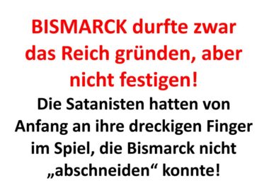 Text des Bildes für die automatische Übersetzung: BISMARCK durfte zwar das Reich gründen, aber nicht festigen! Die Satanisten hatten von Anfang an ihre dreckigen Finger im Spiel, die Bismarck nicht „abschneiden“ konnte!