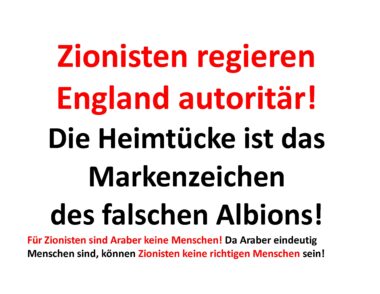 Text des Bildes für die automatische Übersetzung: Zionisten regieren England autoritär! Die Heimtücke ist das Markenzeichen des falschen Albions! Für Zionisten sind Araber keine Menschen! Da Araber eindeutig Menschen sind, können Zionisten keine richtigen Menschen sein!